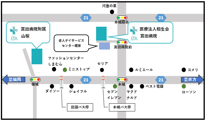 当院周辺地図 車でのアクセス(九州自動車道を利用) 北九州方面からお越しの方は鞍手PA出口を降りて約17分。または、宮田スマートIC出口を降りて約11分。 福岡方面からお越しの方は若宮IC出口を降りて約13分。 電車・バスでのアクセス 駐車場について お車でご来院される患者様・ご家族の方は、病院敷地内の下記駐車場に駐車をお願い致します。